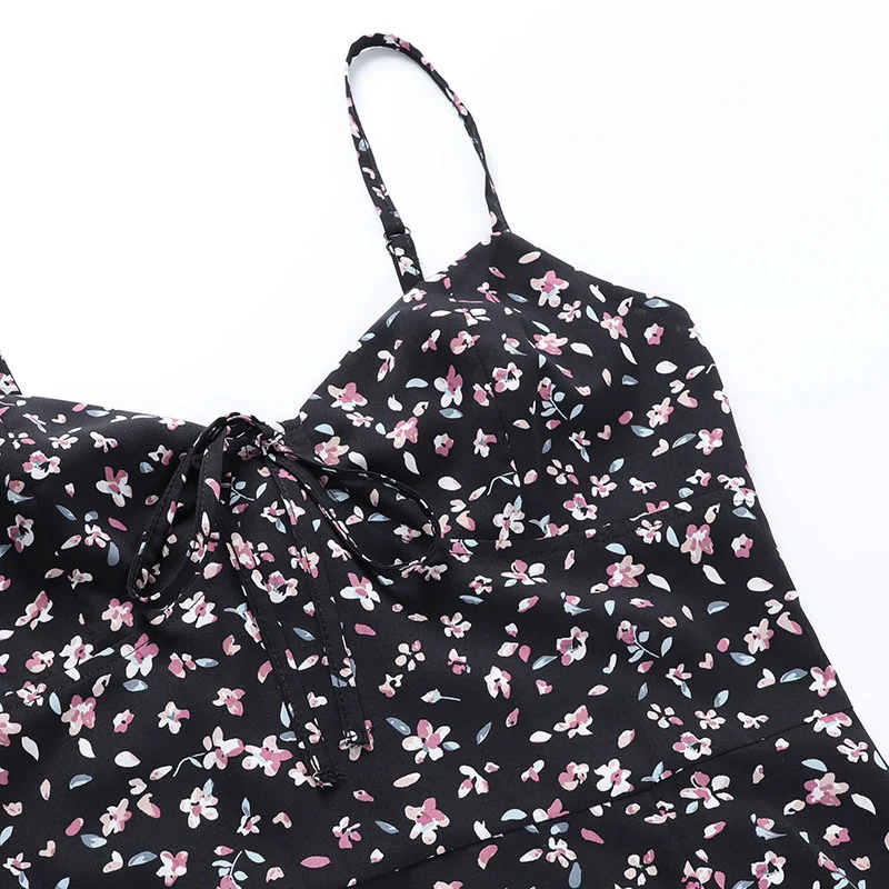 Chic Spaghetti Strap Black Floral Sundress Women Sleeveless V-Neck Mini Bodycon Dress Summer Ladies Sling Backless Vestido