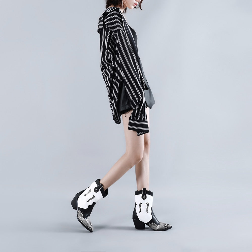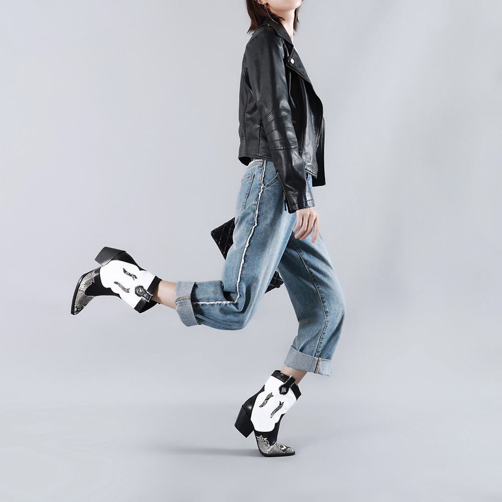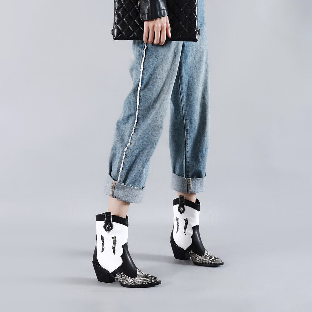 Cossacks Mixed Colors PU Leather Cowboy Ankle Boots Women Wedge High Heel Booties Snake Print Western Cowgirl Boot 2022 Female