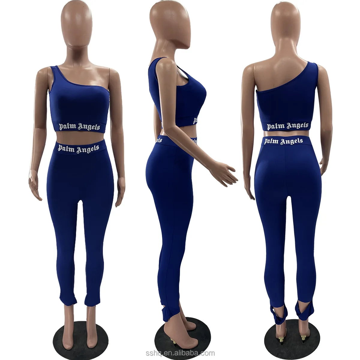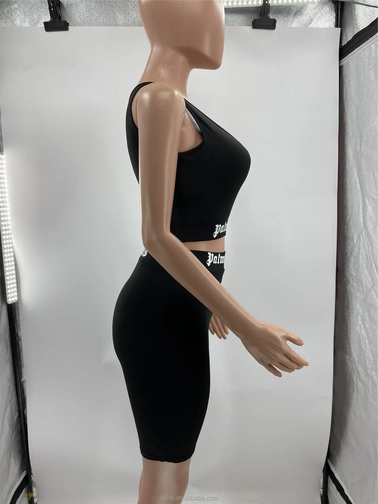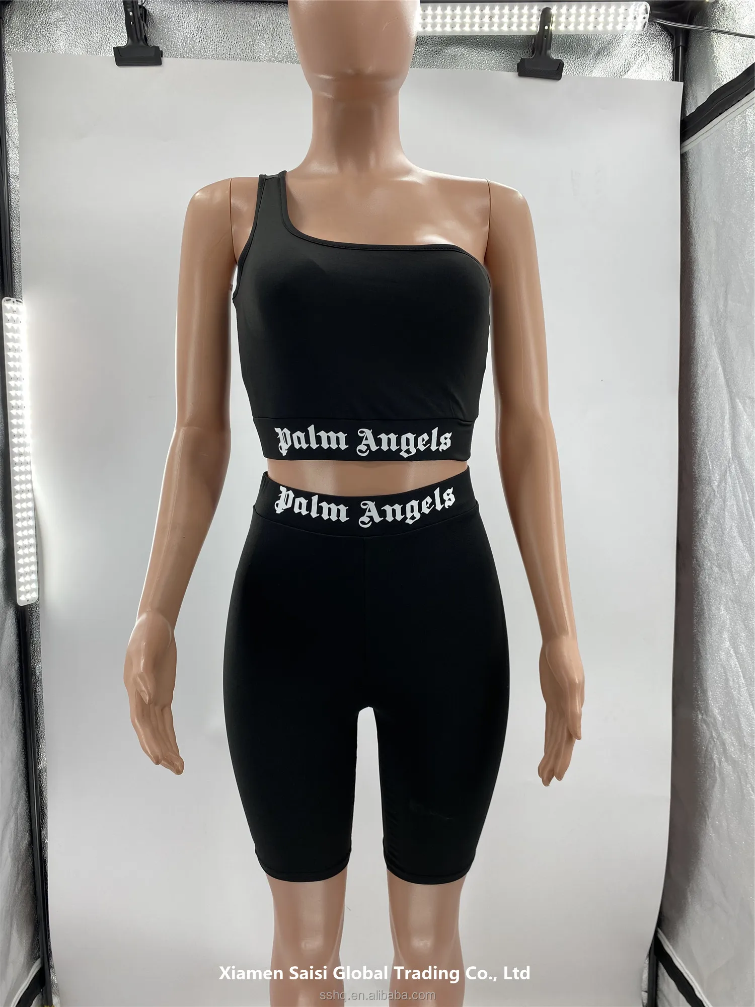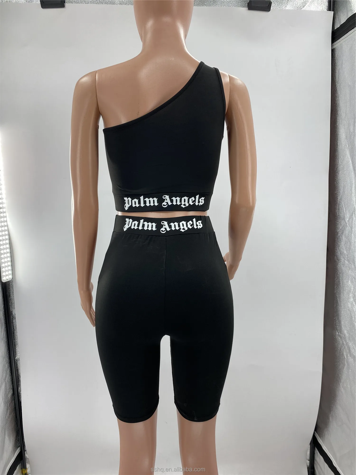 custom logo women crop top sleeveless bottom cut one shoulder two piece pants set yoga sports wear biker shorts
