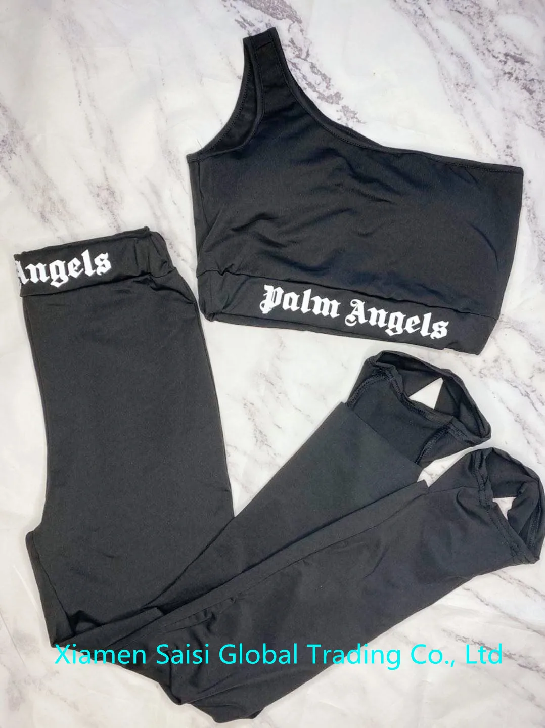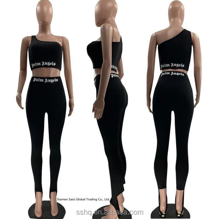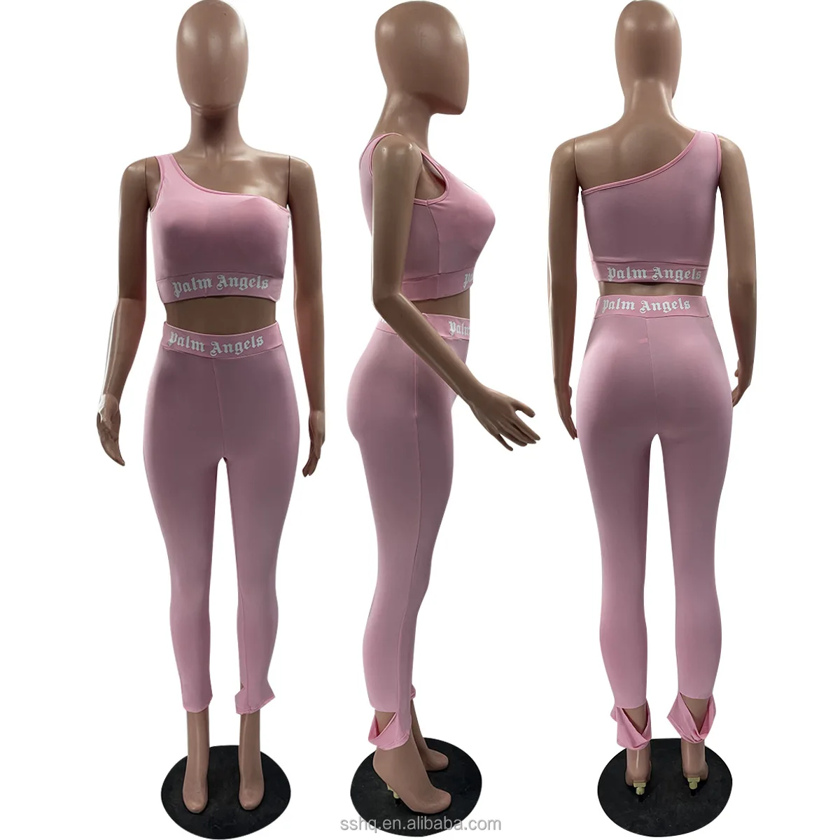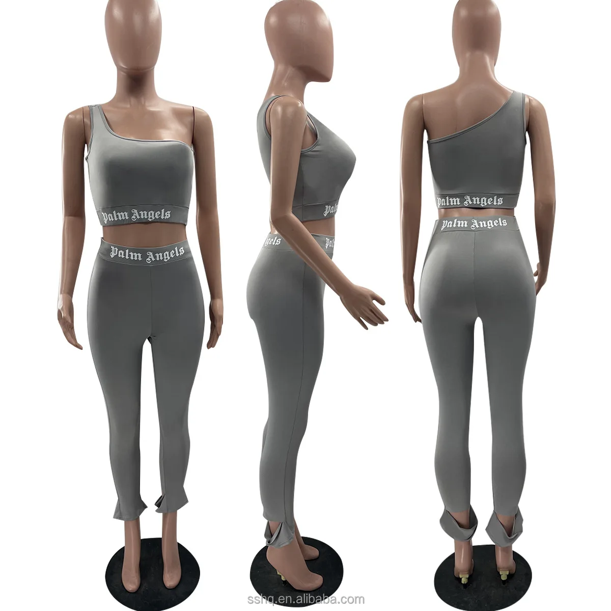 custom logo women crop top sleeveless bottom cut one shoulder two piece pants set yoga sports wear biker shorts