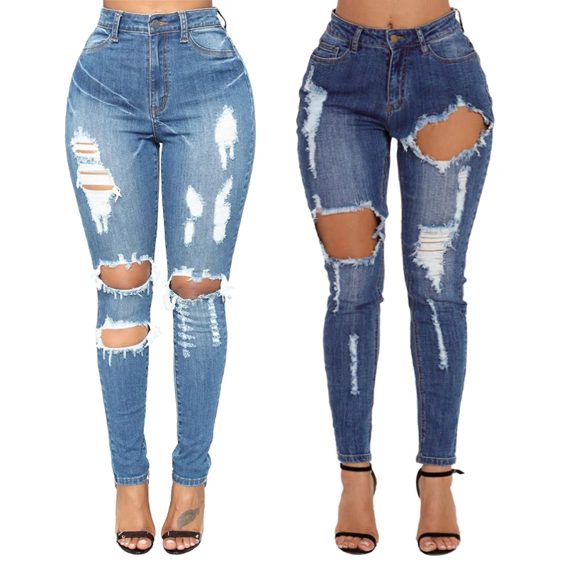 High Quality OEM Women Light Blue High Waist Destroyed Jeans