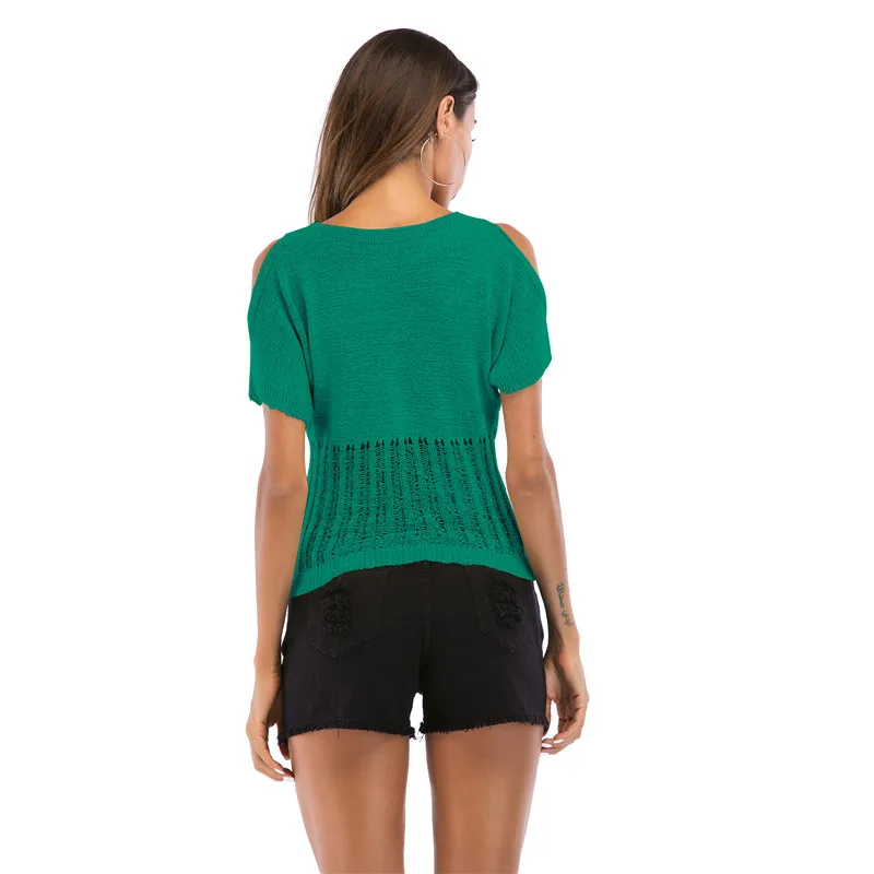 Factory Design Casual Fashion V Neck Short Sleeve Hollow Out T Shirt Knit Solid Color Pullover Summer 2021 Tops Crop Women