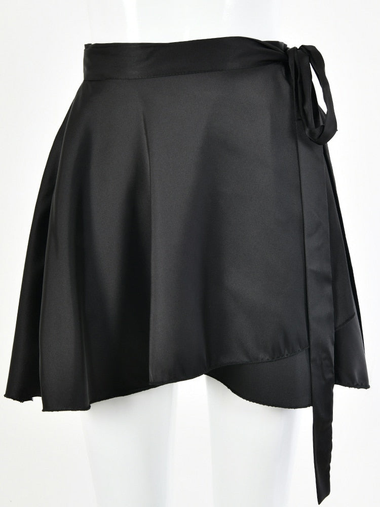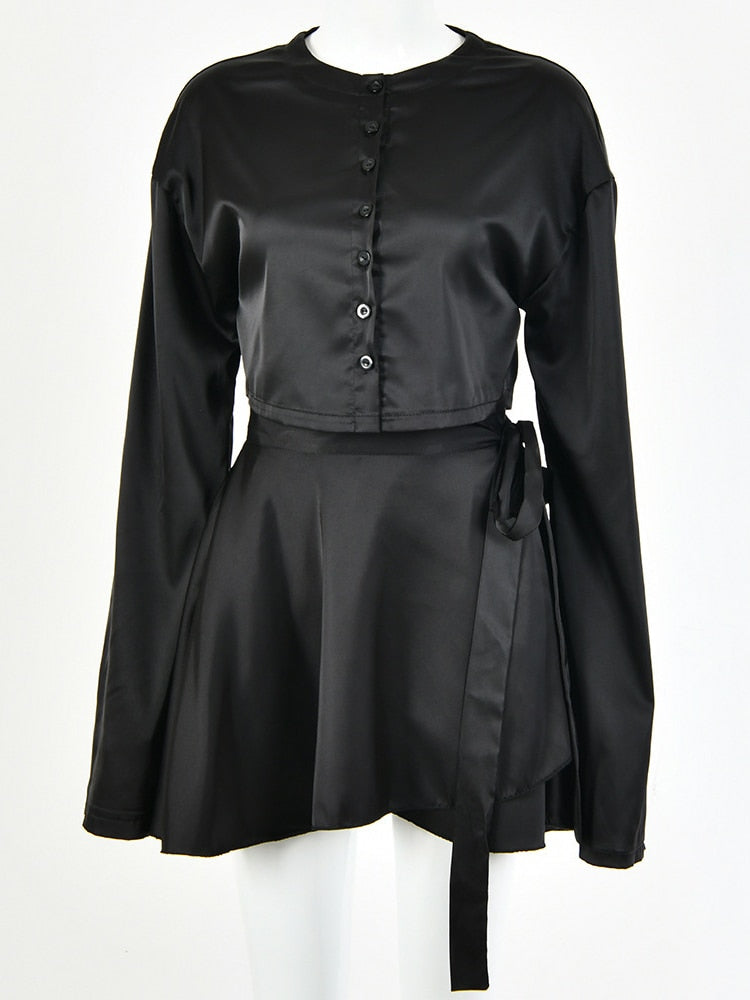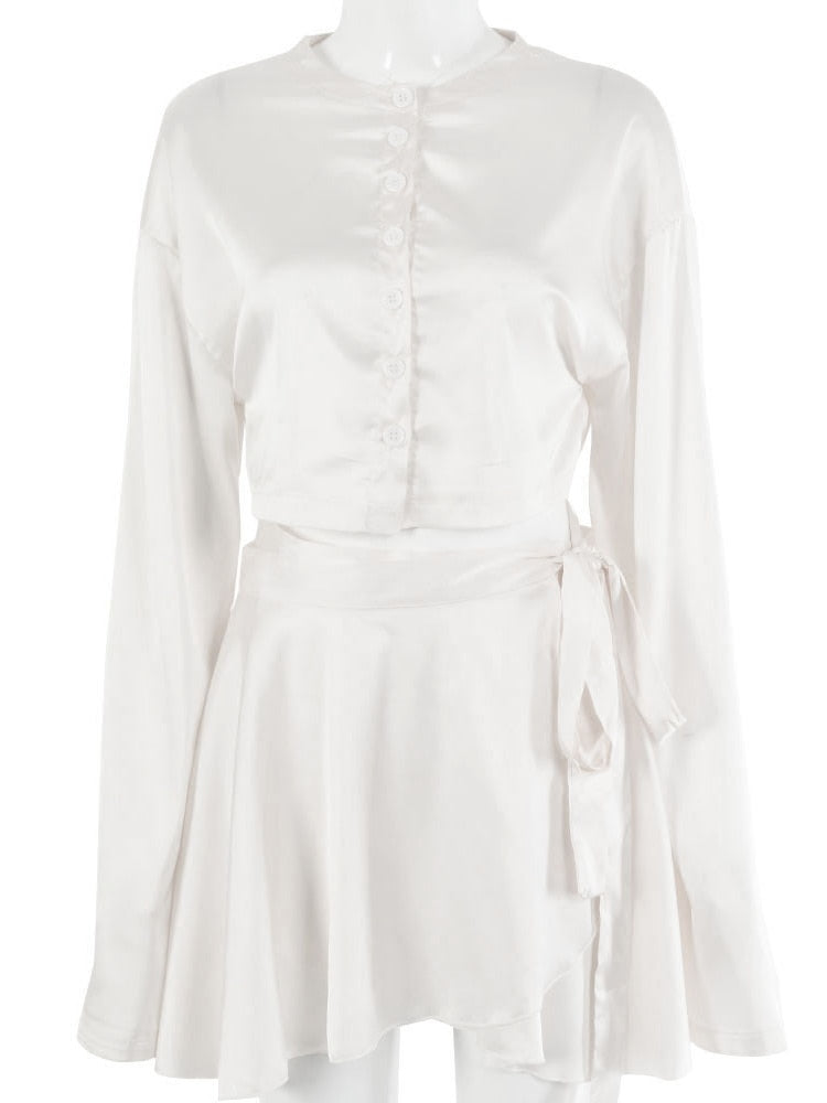 Fantoye Casual Satin Two Piece Dress Set For Women White O-neck Button Top Bandage Mini Pencil Skirts Outfits Fashion Party Suit
