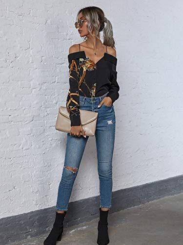 Floerns Women's Off The Shoulder Long Sleeve Button Front Blouse Shirt Tops Black XL