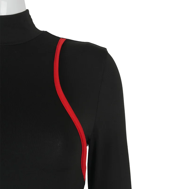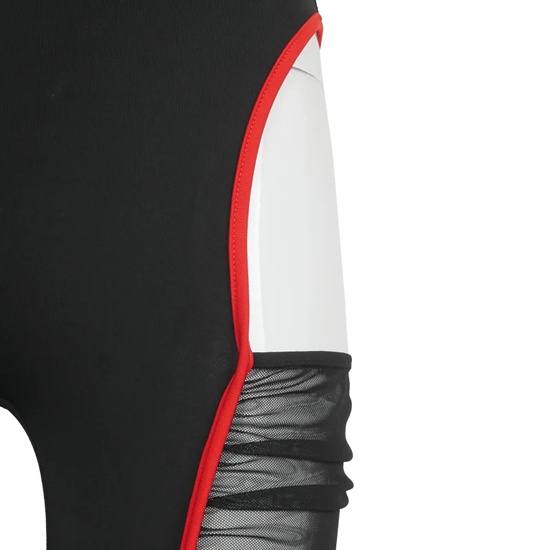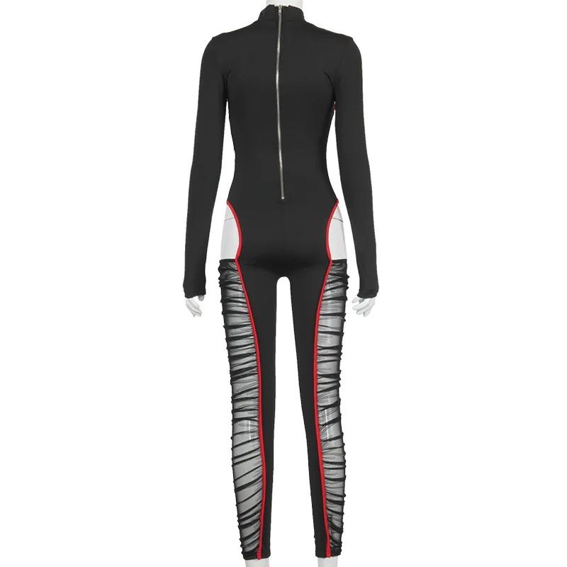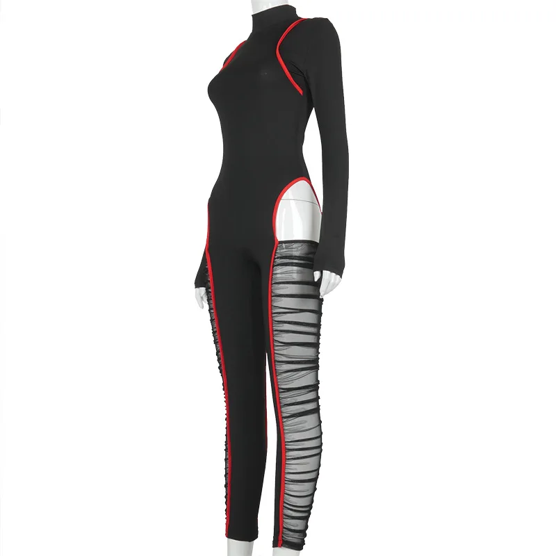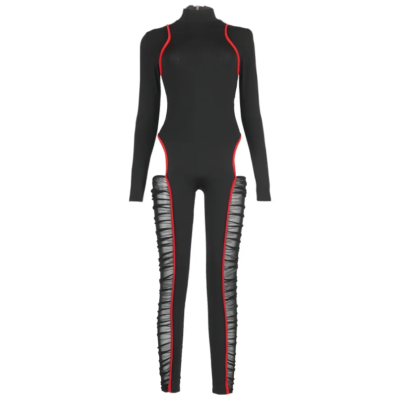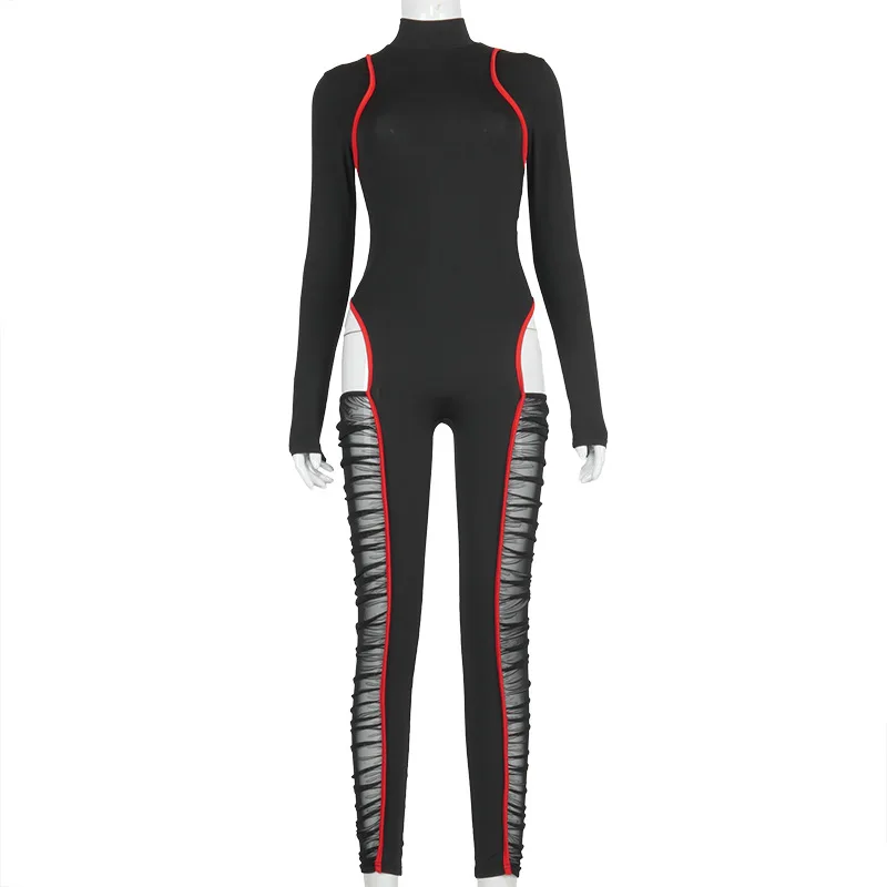 Free Shipping First Order Contrasting Color High Neck Hollow Back Zipper Outer Mesh Jumpsuit