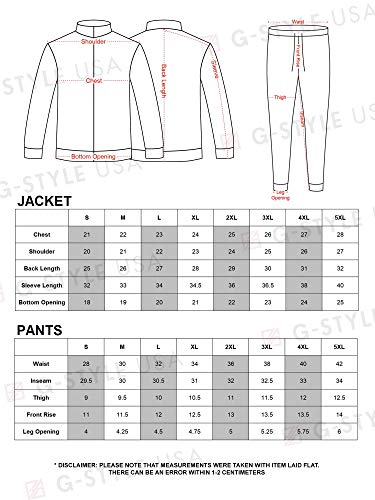 Details: G-Style USA Men's Zipper Jacket Drawtsring Waistband Sweatpants Tracksuit Set This sporty mens tracksuit features different design patterns with side band detailing on the side. Perfect for jogging, casual wear or a busy active day. Inspired by the latest high fashion trends, this tracksuit are the perfect outfits to show off your style and character. Made with quality and comfort in mind for that perfect fit. Band on waist, collar, arm, and leg cuffs Adjustable drawstrings on waist Two pocket structure on jacket, Three pocket structure on pants Machine wash cold inside-out on gentle cycle with like colors, line dry