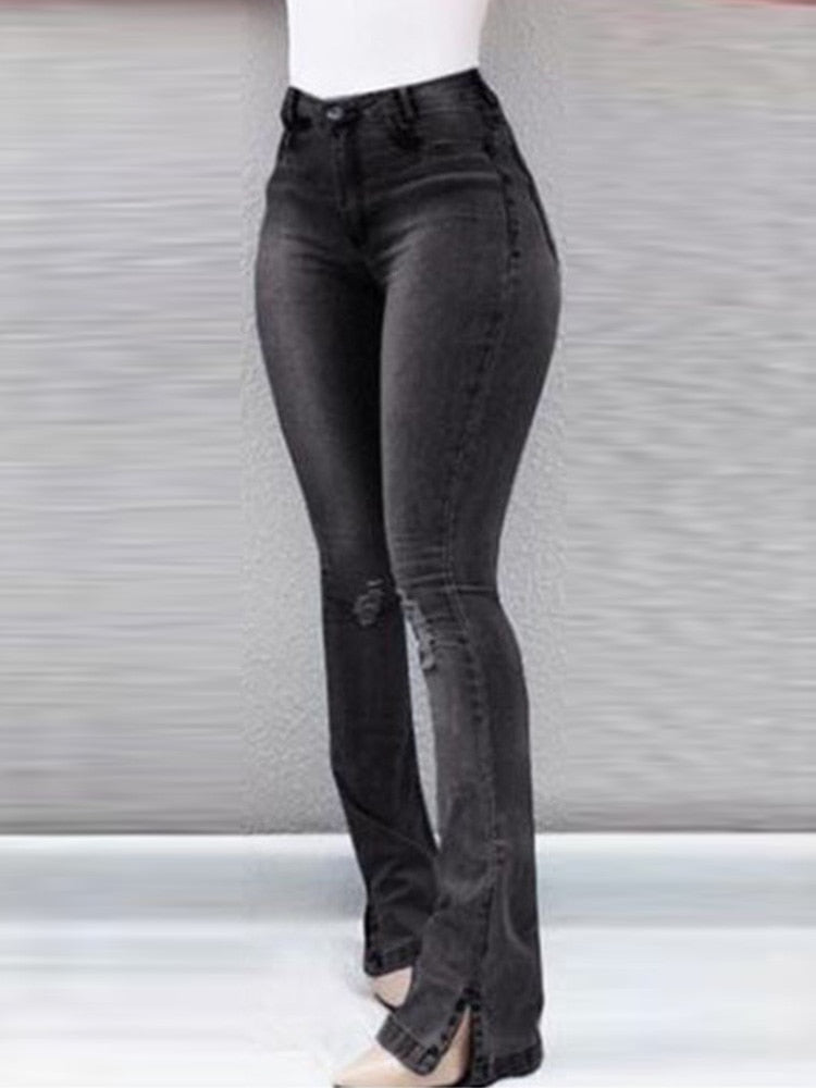 High Waist Ripped Bell-Bottom Jeans Women Pockets Design Casual Denim Pants