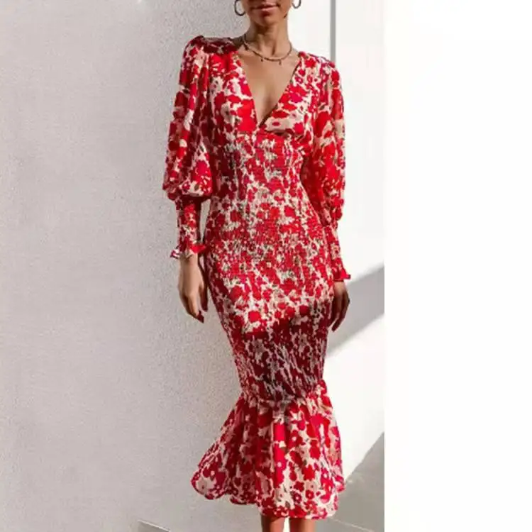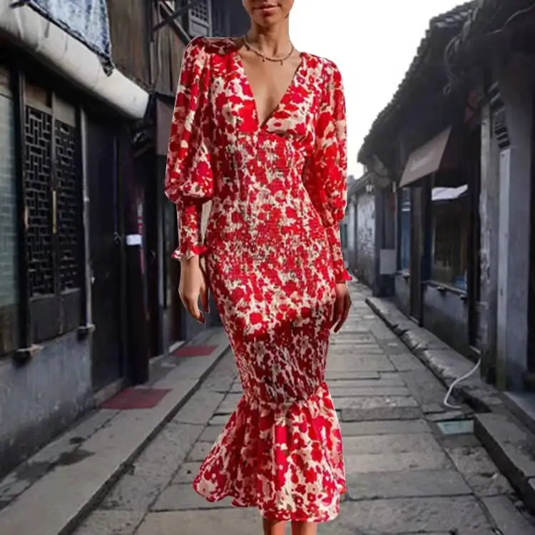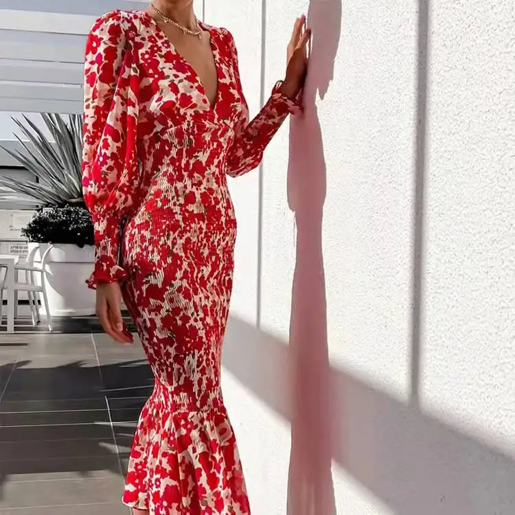 korean style V-neck creative red white dense print flower dresses for elegant women high waist casual oblique fishtail dresses