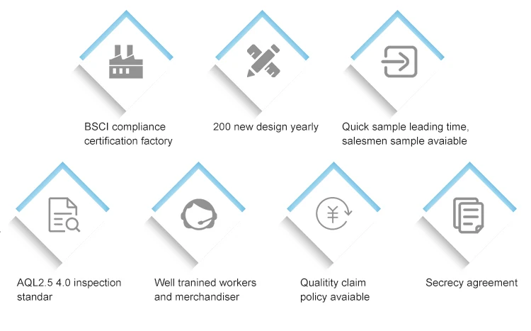 BSCI compliance certification factory. 200 new design yearly Quick sample leading time,salesmen sample avaiable AQL2.5 4.0 inspection standar well tranined workers and merchandiser secrecy agreement qualitity claim policy avaiable payment L/C and TT