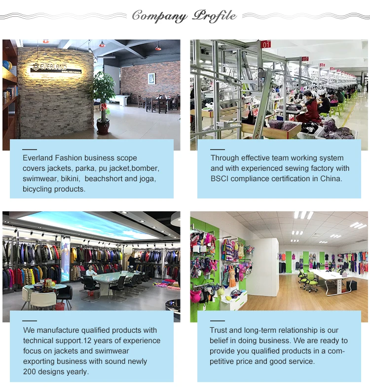 Everland Fashion Co., Limited was set up in 2004. While through effective team working system and with experienced sewing factory with BSCI compliance certification in China. We manufacture qualified products with technical support.