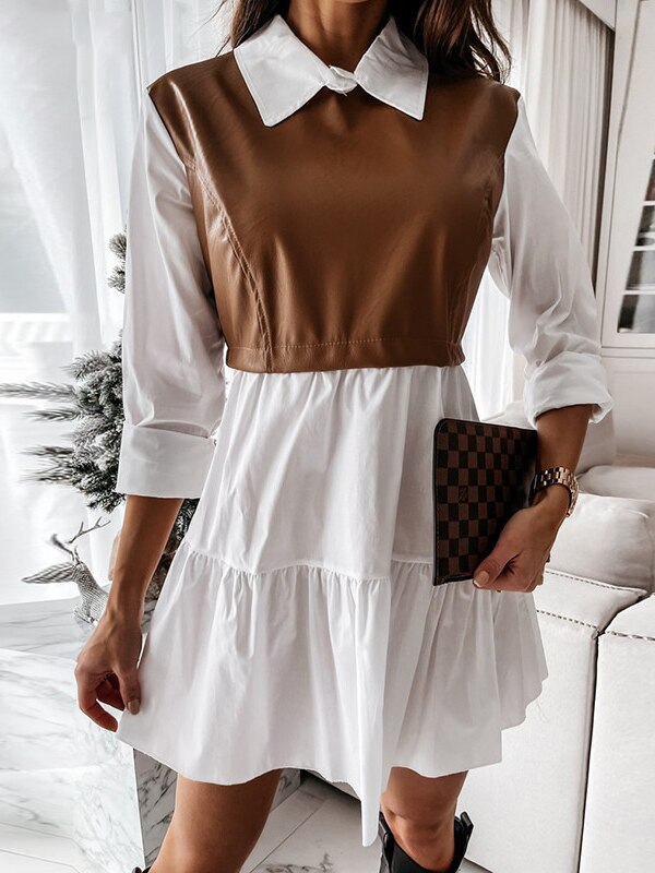 Nadafair Plaid Women's Dress Casual 2021 A-Line PU Leather Patchwork Long Sleeve Vestidos Party Elegant Short Mini Dress Women