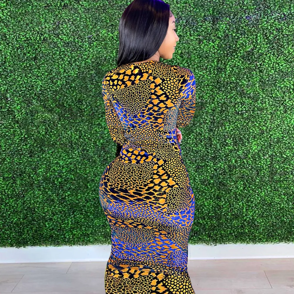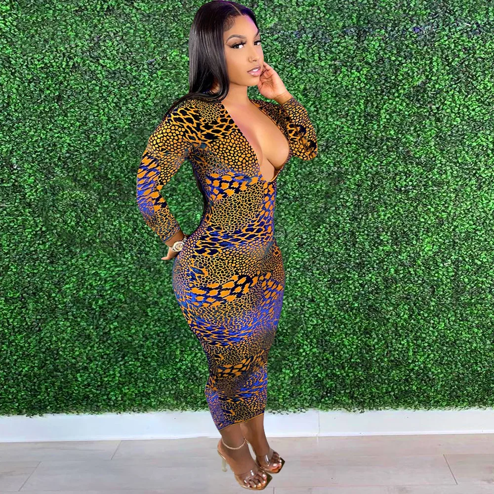 New Womens Fashion Casual Fall Sexy V-neck Long Sleeve Colorful Club Evening Dresses Printed One-piece Dress
