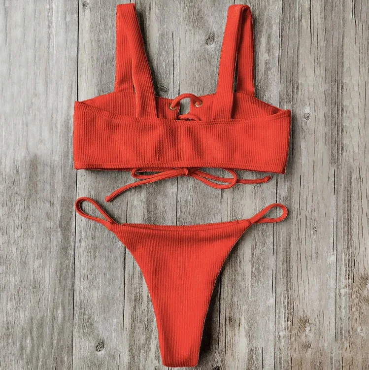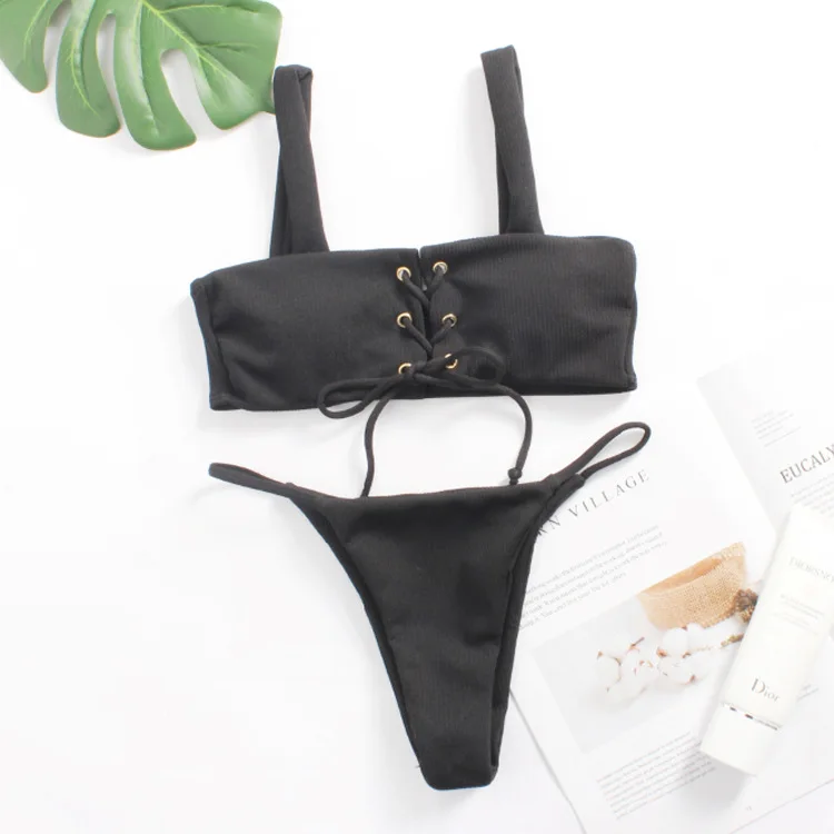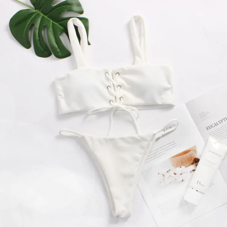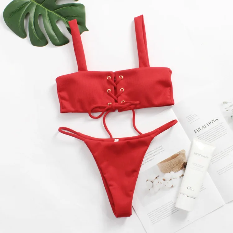 Sexy bikini solid color open back strappy thong swimsuit sexy split swimsuit women