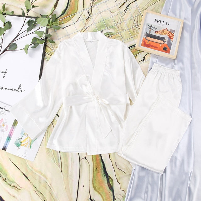Solid Color Sleepwear Loose Flare Home Pants Three Quarter Sleeve Satin Robe Sets Bathrobe For Women Pajama Fashion Spring 2021