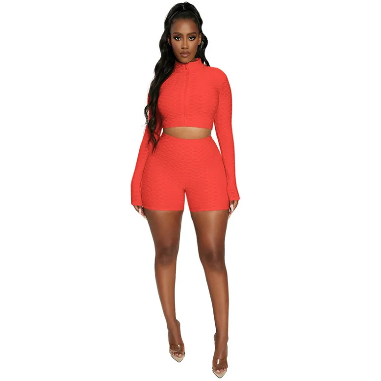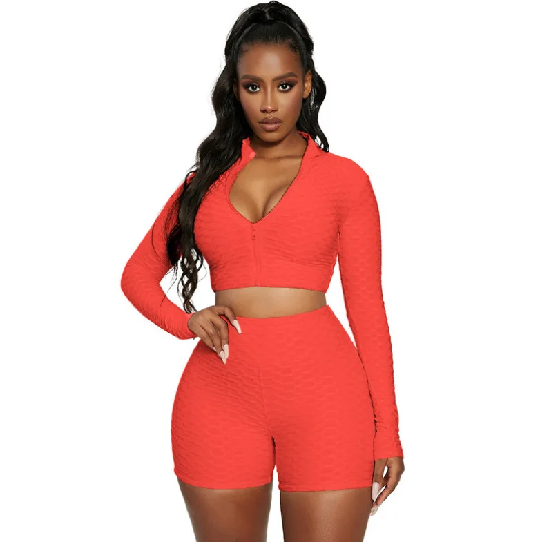 Summer New Women 2 Pieces Long Sleeve Zipper Sports Set Fitness Activer Wear Crop Top Shorts Yoga Set