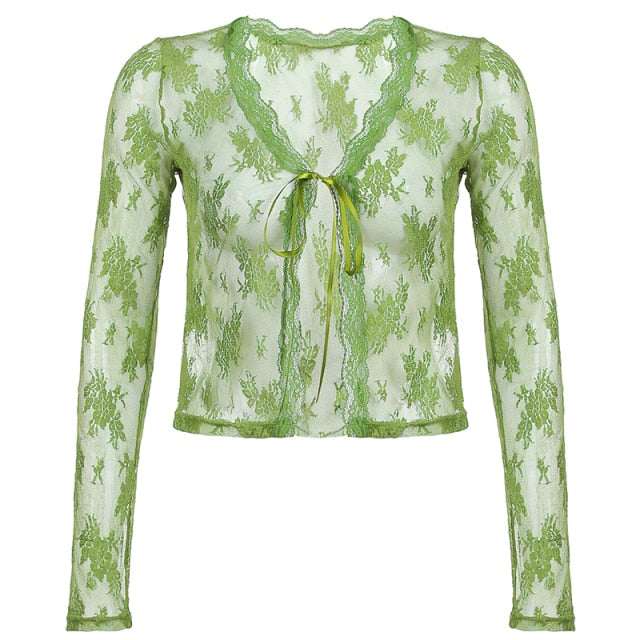 Sweetown Brown Vintage New Lace Crop Top Short Sleeve See Through Sexy Mesh Woman Tshirts V Neck Lace Up Floral Kawaii Clothes