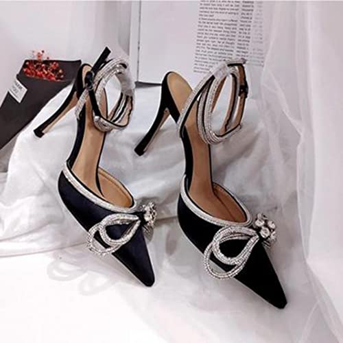 Vertundy Women's Lace up High Heeled Sandals Ankle Buckle Strap Rhinestone Bowknot Stilettos Satin Pointy Pumps (Black,US size8)