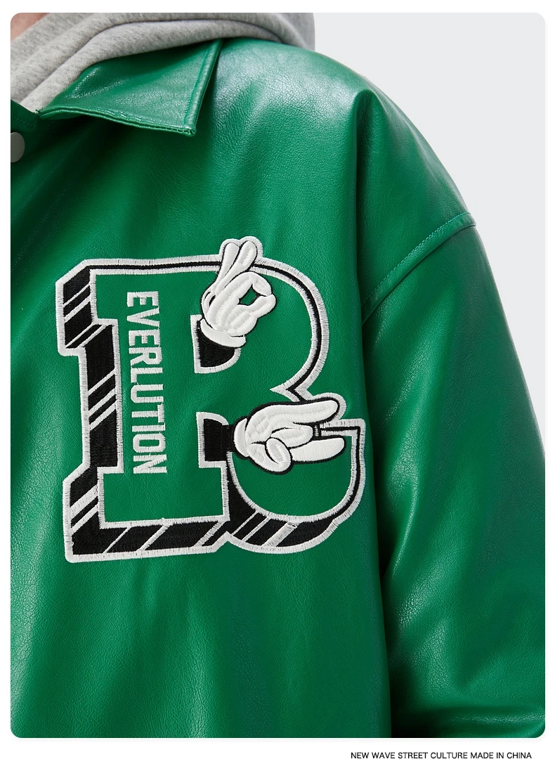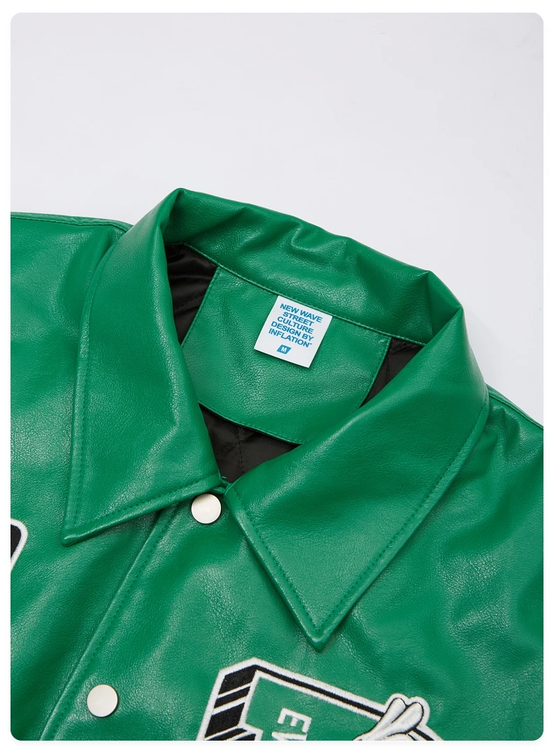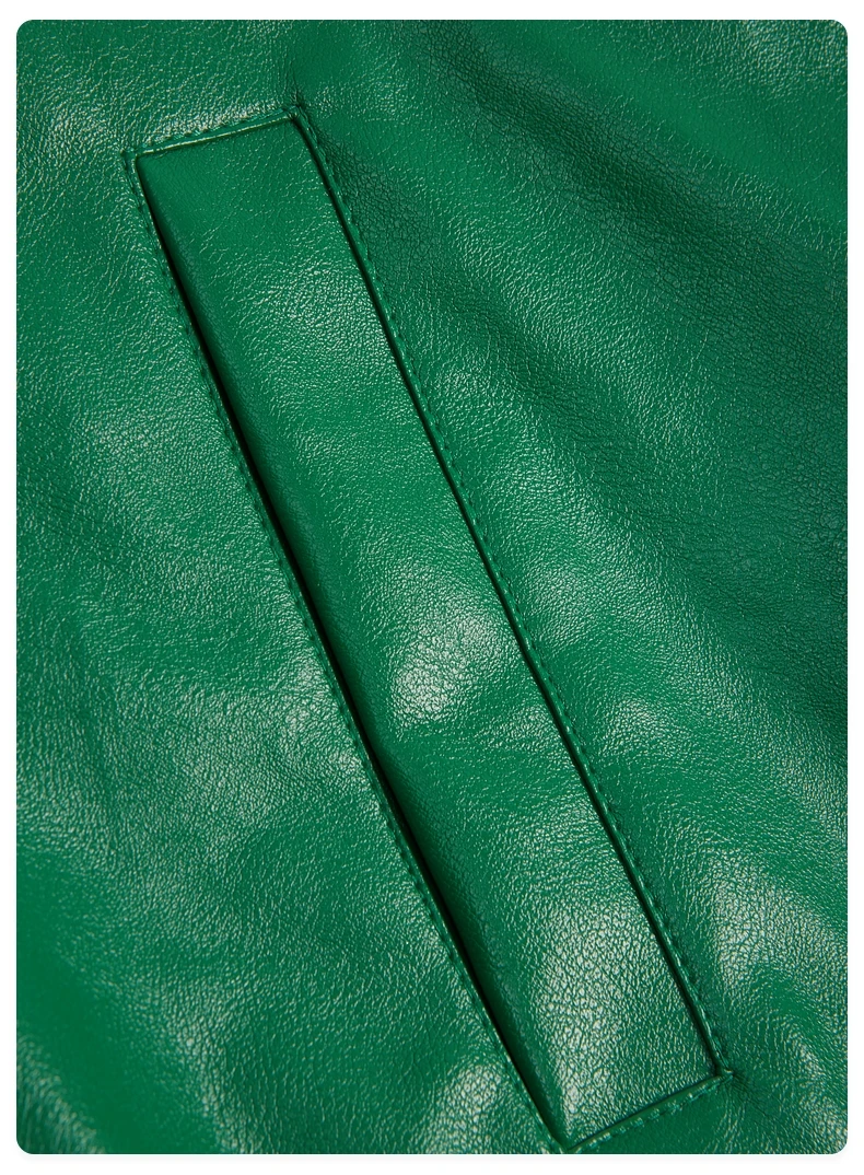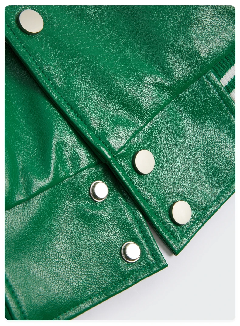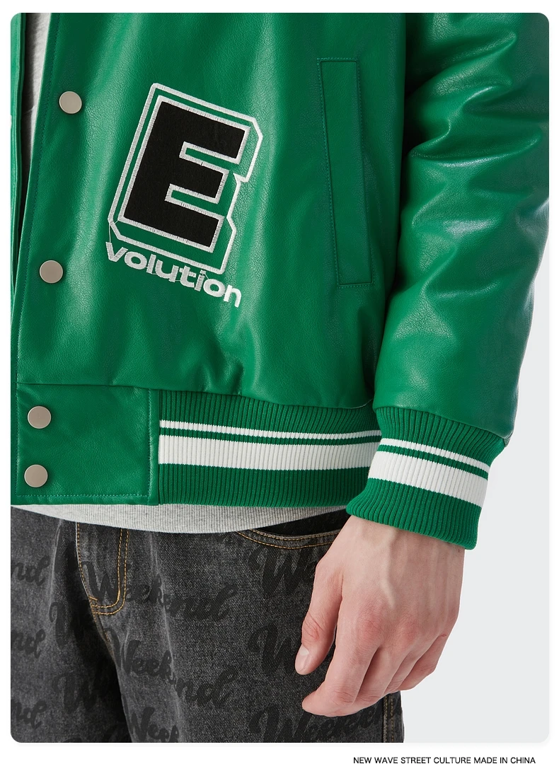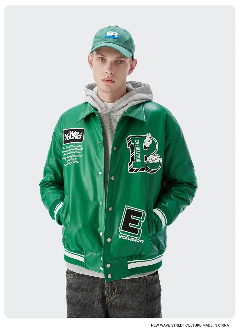 Wholesale OEM Streetwear Embroidery Varsity Jacket Green Motorcycle PU Leather Jacket & Coats