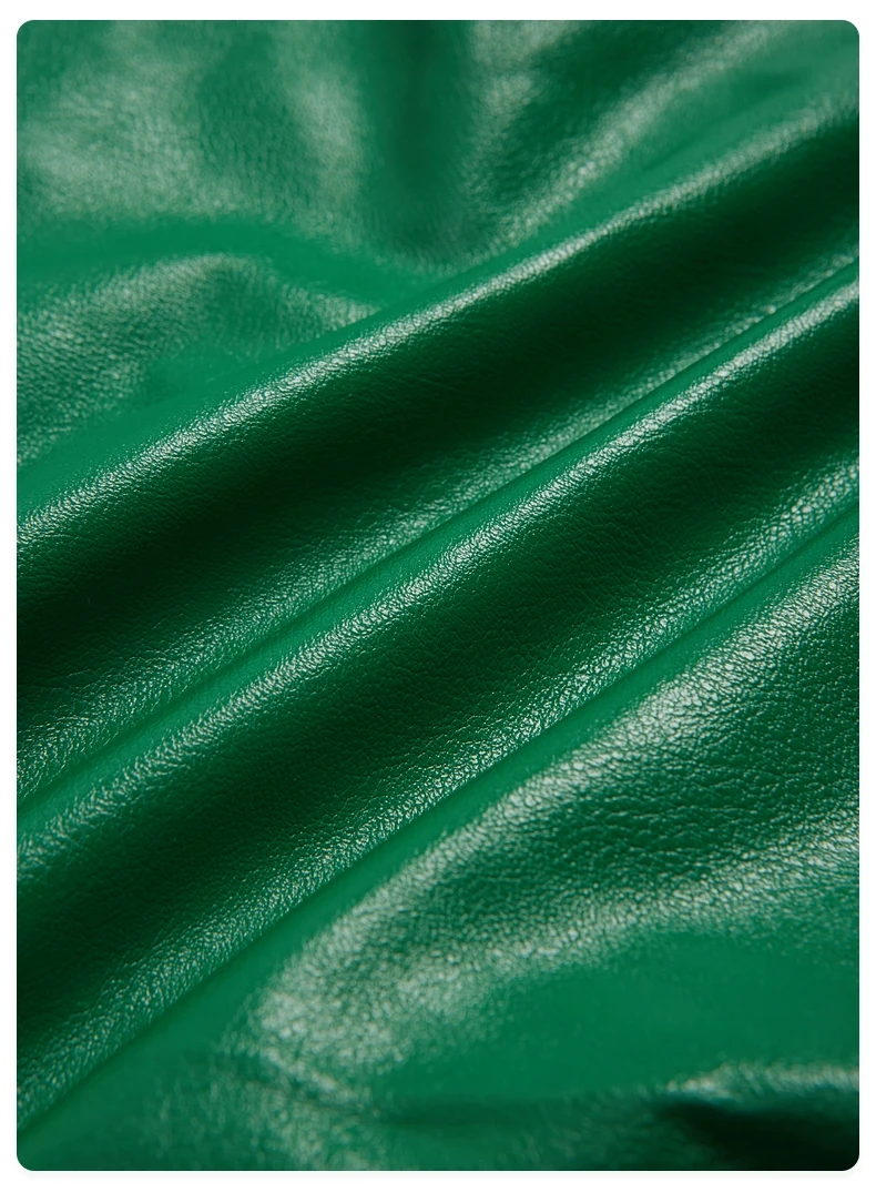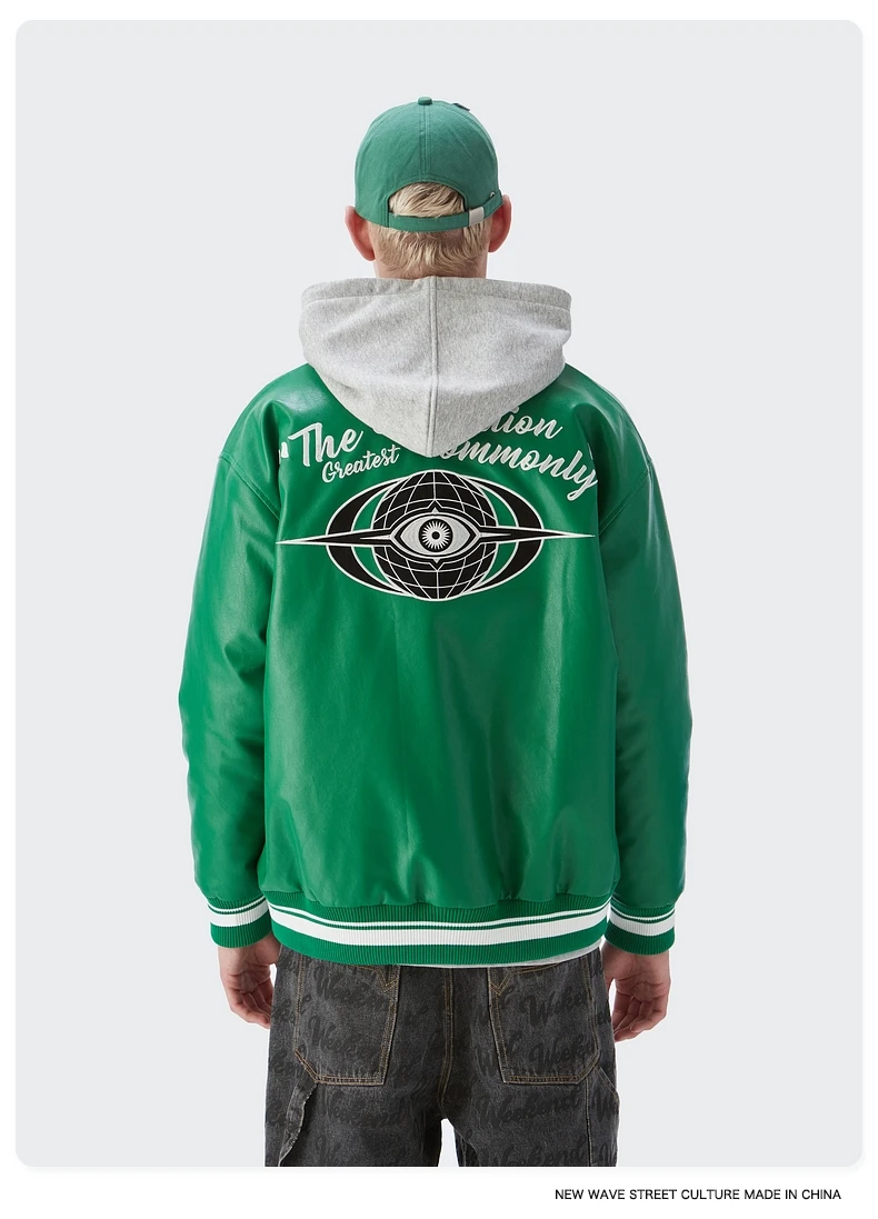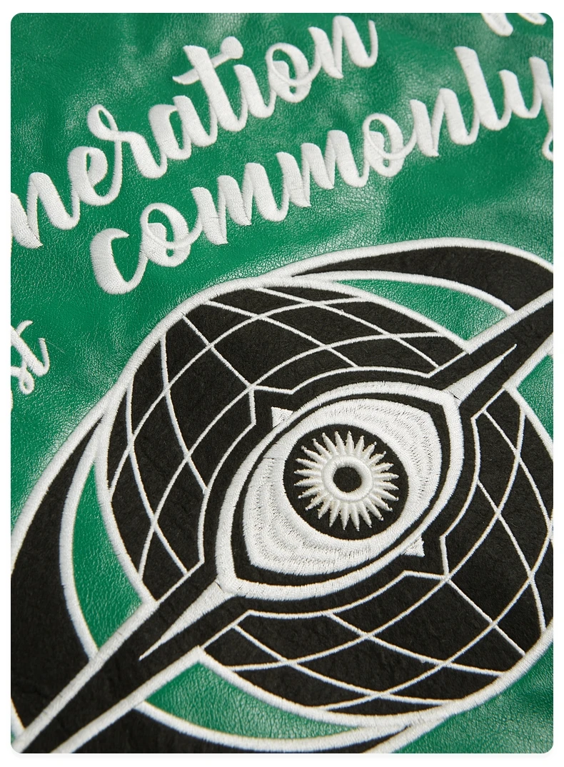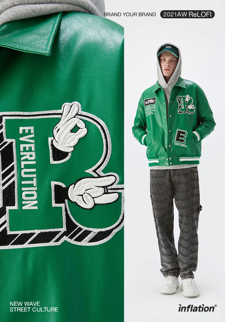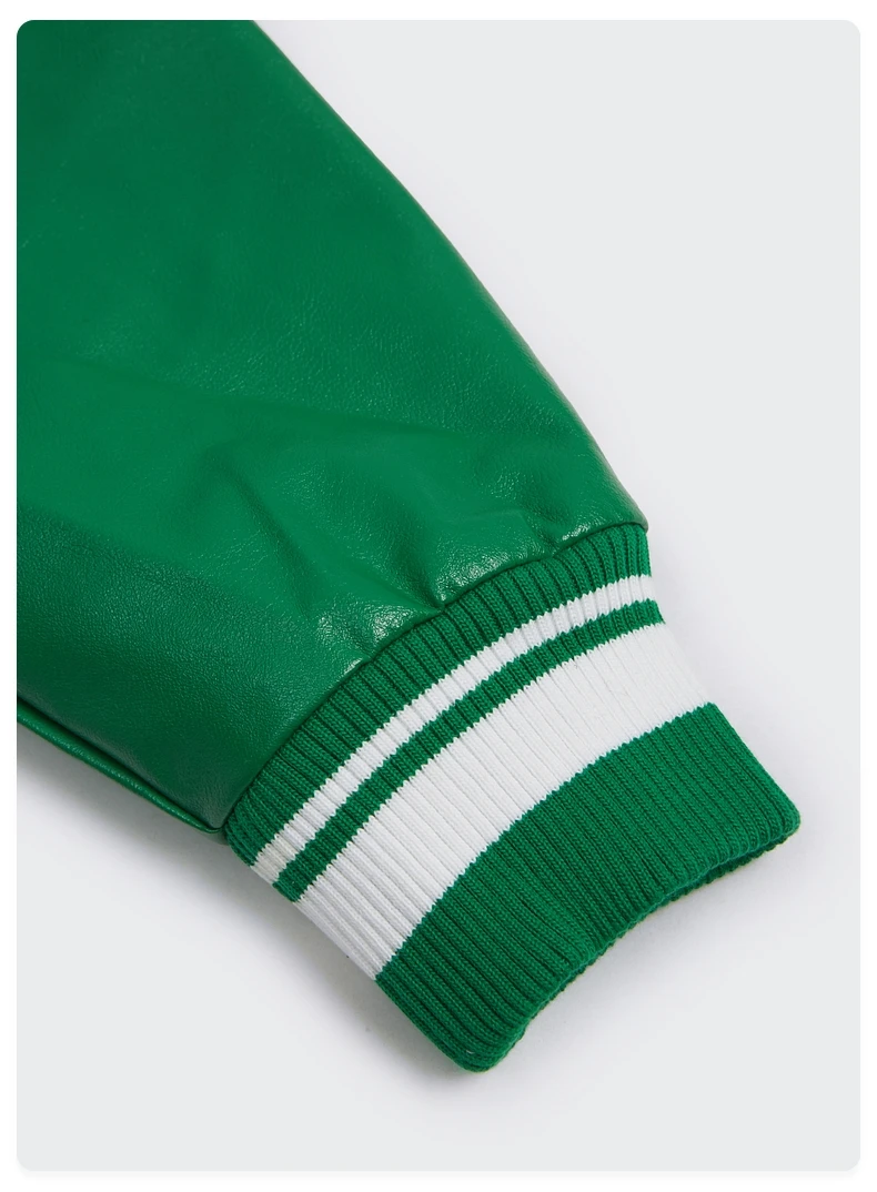 Wholesale OEM Streetwear Embroidery Varsity Jacket Green Motorcycle PU Leather Jacket & Coats