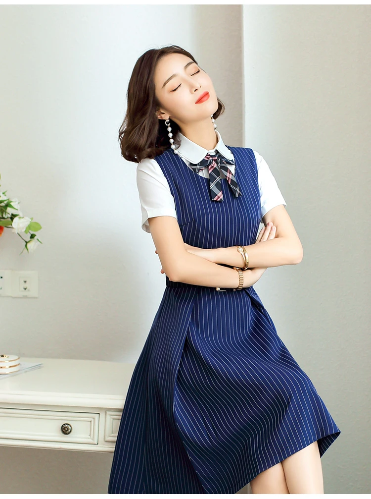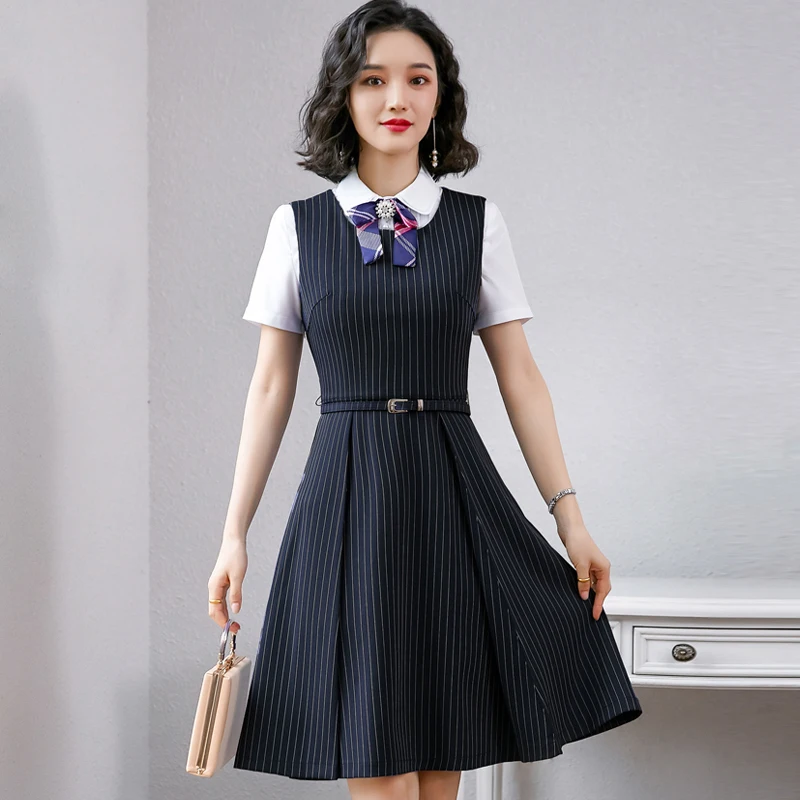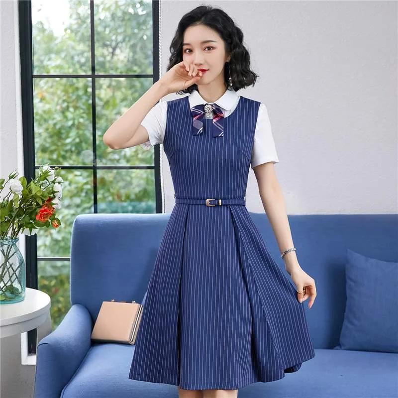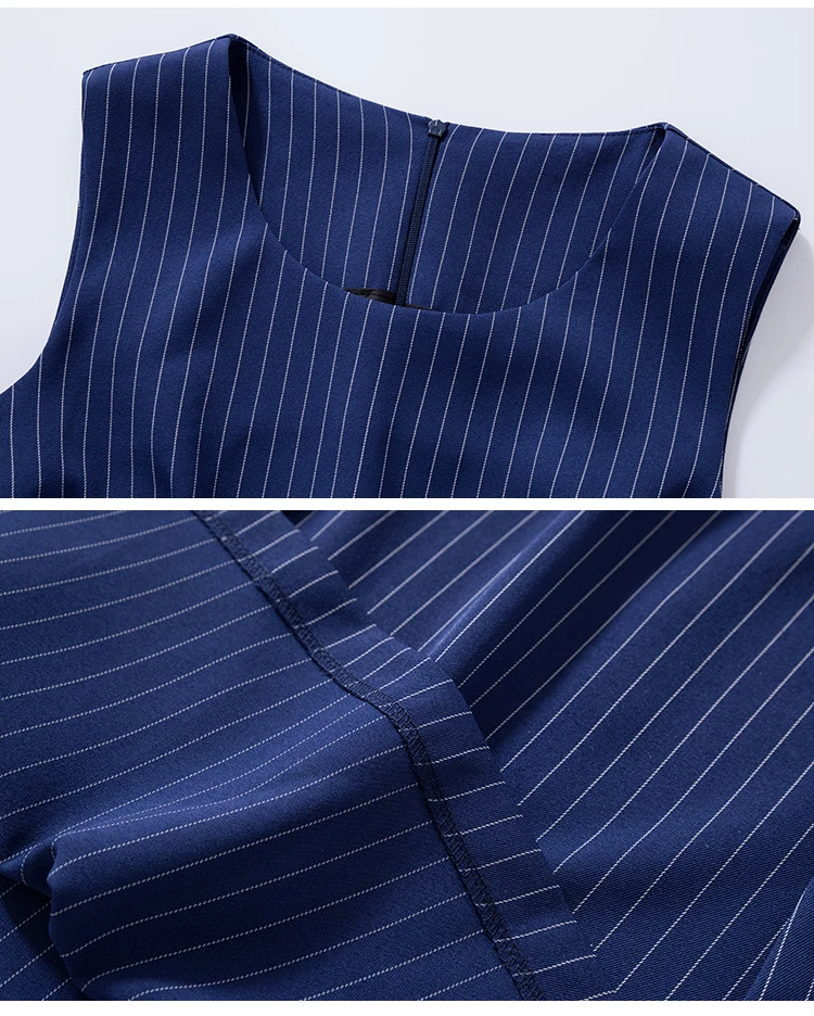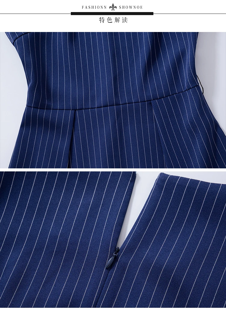 Wholesale Women Sleeveless Pleated Dress Dealers o-neck Blue Slim Office Lady Work Wear Teacher JK Uniform With Lining