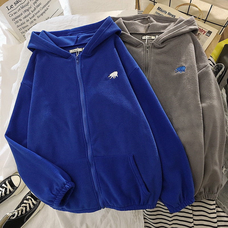 Winter Women's Hoodie Tops Autumn Korean Fashion Animal Embroidery Printing Loose Plush Zipper Sweatshirt
