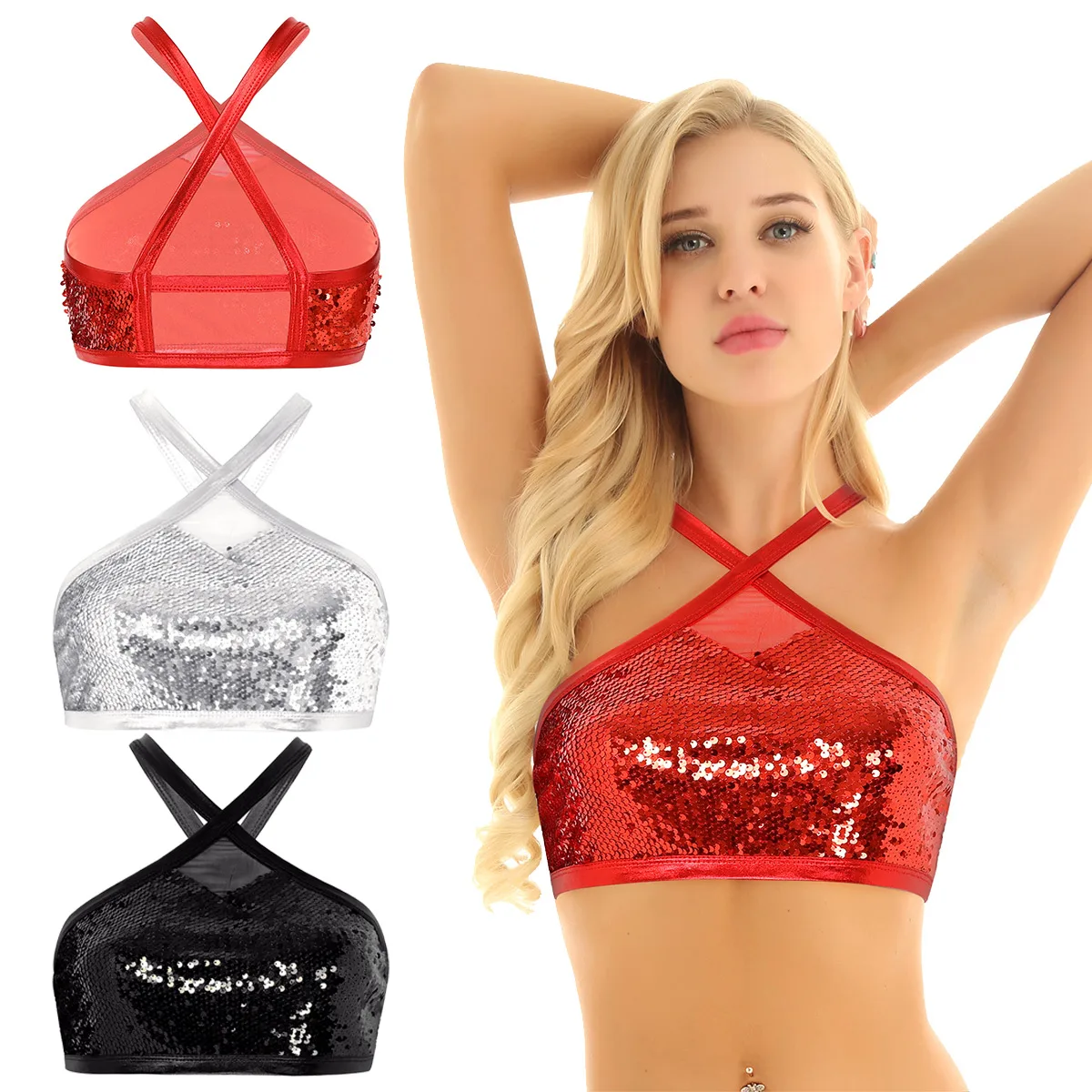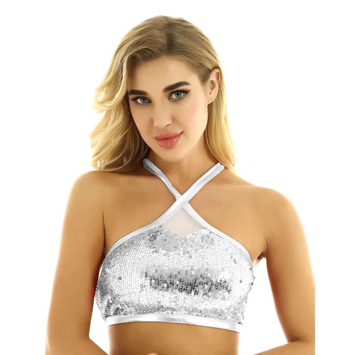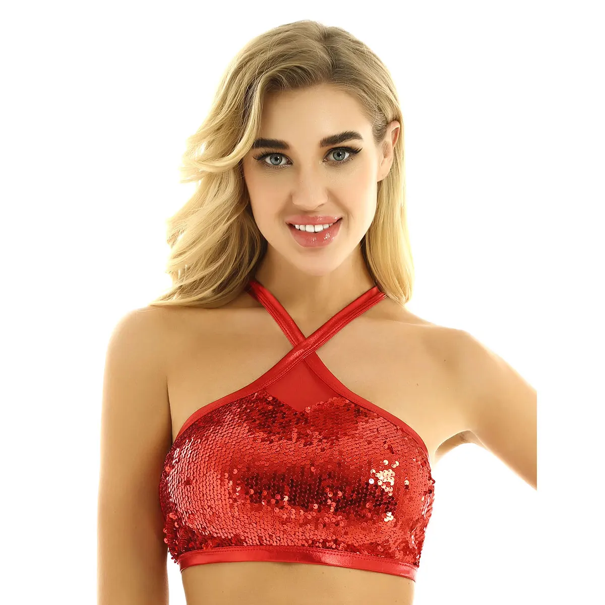 Women's Sparkly Sequins Bra Vest Crop Tops Sexy Halter Neck Sleeveless Back Cross Dances Clubwear Tank Top